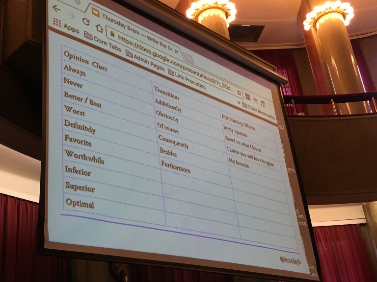 Be careful to not make assumptions about your audience. Your experiences and expertise will shine through in the docs. But, you can accidentally make assumptions, like “python coders all know how to use a command line.” This isn’t true. So think through the way these experiences and opinions are reflected in the docs. Thursday tends to looks for certain words while editing to identify areas where she may have found a writers opinion instead of what readers need to know.