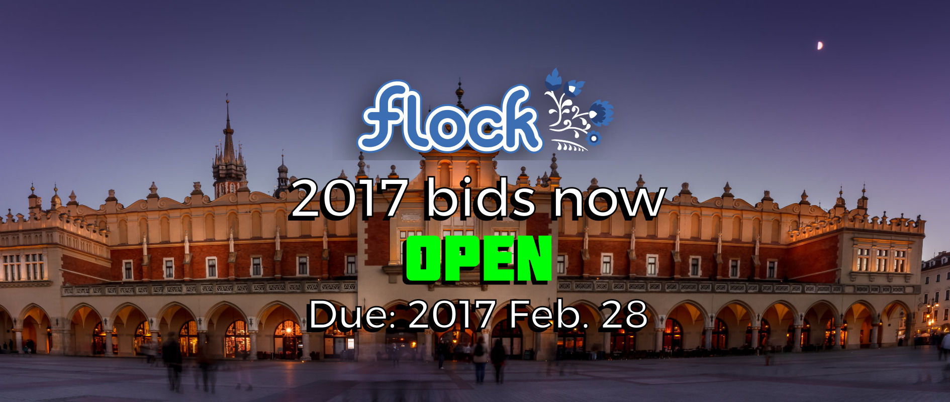It is time to start the bid process for this year’s Flock. This year we are back in North America for Flock 2017. If you’d like to help host the event in your city, it’s time to start putting together a bid. To find out what you need to do, read the wiki page. Bids are due by February 28, 2017, so do not wait to start. It takes more time than you may realize to compile all the required information for a good bid.